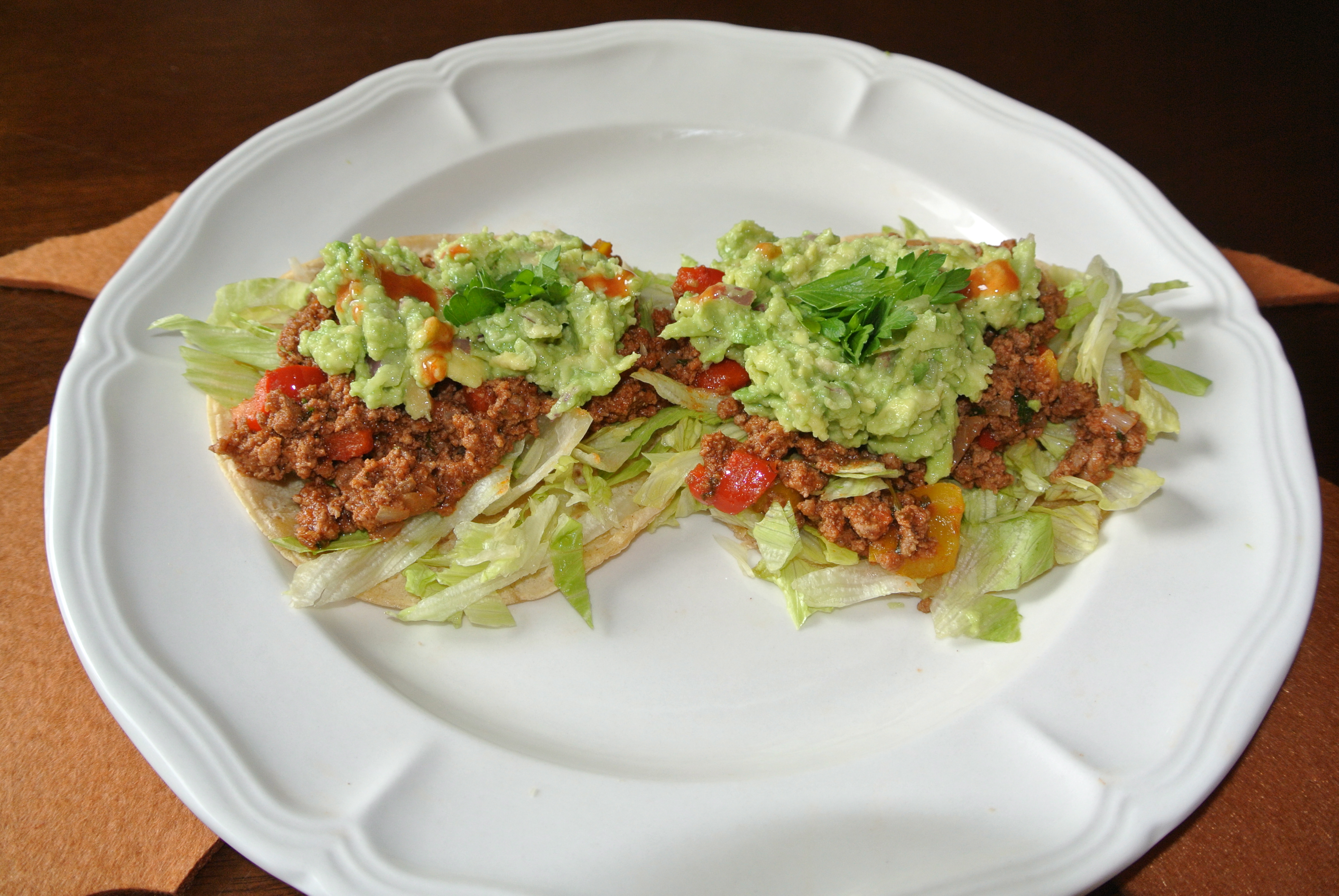 When finished place shells on bottom, add whatever lettuce you like, throw on the meat mixture and then top with good ole guacamole!!! YUM!!!